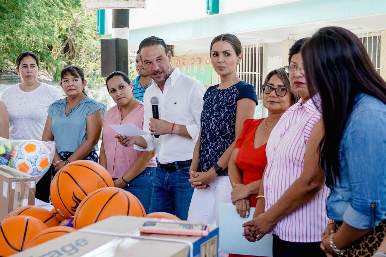 Unánue Abascal fue acompañado por la Presidenta del DIF Municipal, Melina Rivera de Unánue, a realizar la entrega de insumos a las primarias que integran la Supervisión Escolar Zona 141.