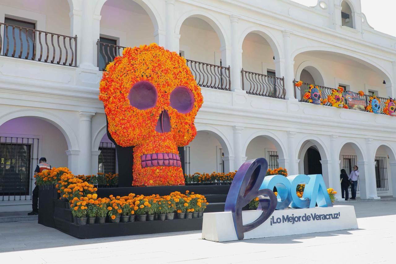 Como parte del programa “Día de Muertos en Boca”, en la Plaza Cívica Benito Juárez se instaló una calavera monumental decorada con flores de cempasúchil, la cual se ha convertido en un bello escenario para que las familias y visitantes se tomen fotografías.