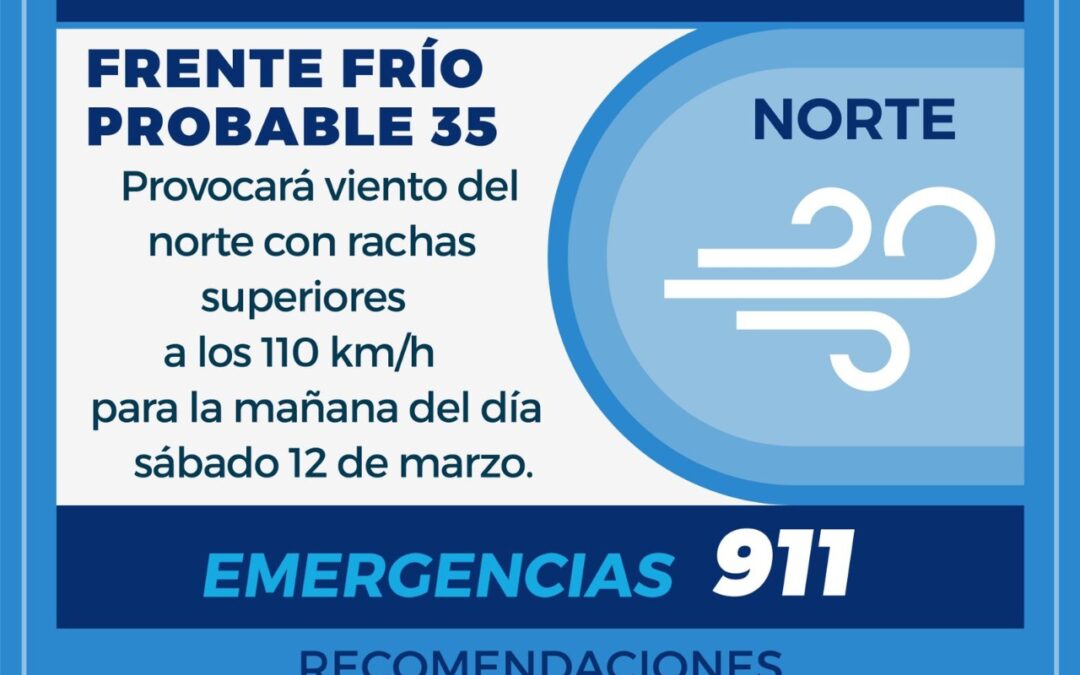Ante la Alerta Gris emitida por las autoridades estatales por el ingreso del Frente Frío (posible No. 35), Protección Civil de Boca del Río informó que se pronostica vientos del norte con posibles rachas máximas de 110 km/h para este sábado 12 de marzo.