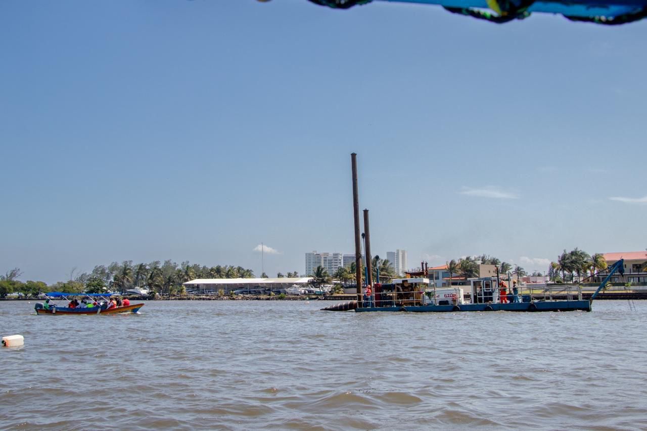 Juan Manuel Unánue Abascal, junto el gobernador Cuitláhuac García Jiménez y el titular de la Procuraduría Estatal de Protección al Medio Ambiente, observaron como las dragas de succión de alta capacidad trabajan, detallando que hasta el momento se han extraído 180 mil metros cúbicos de material acumulado, como es el caso de lodo y arena.