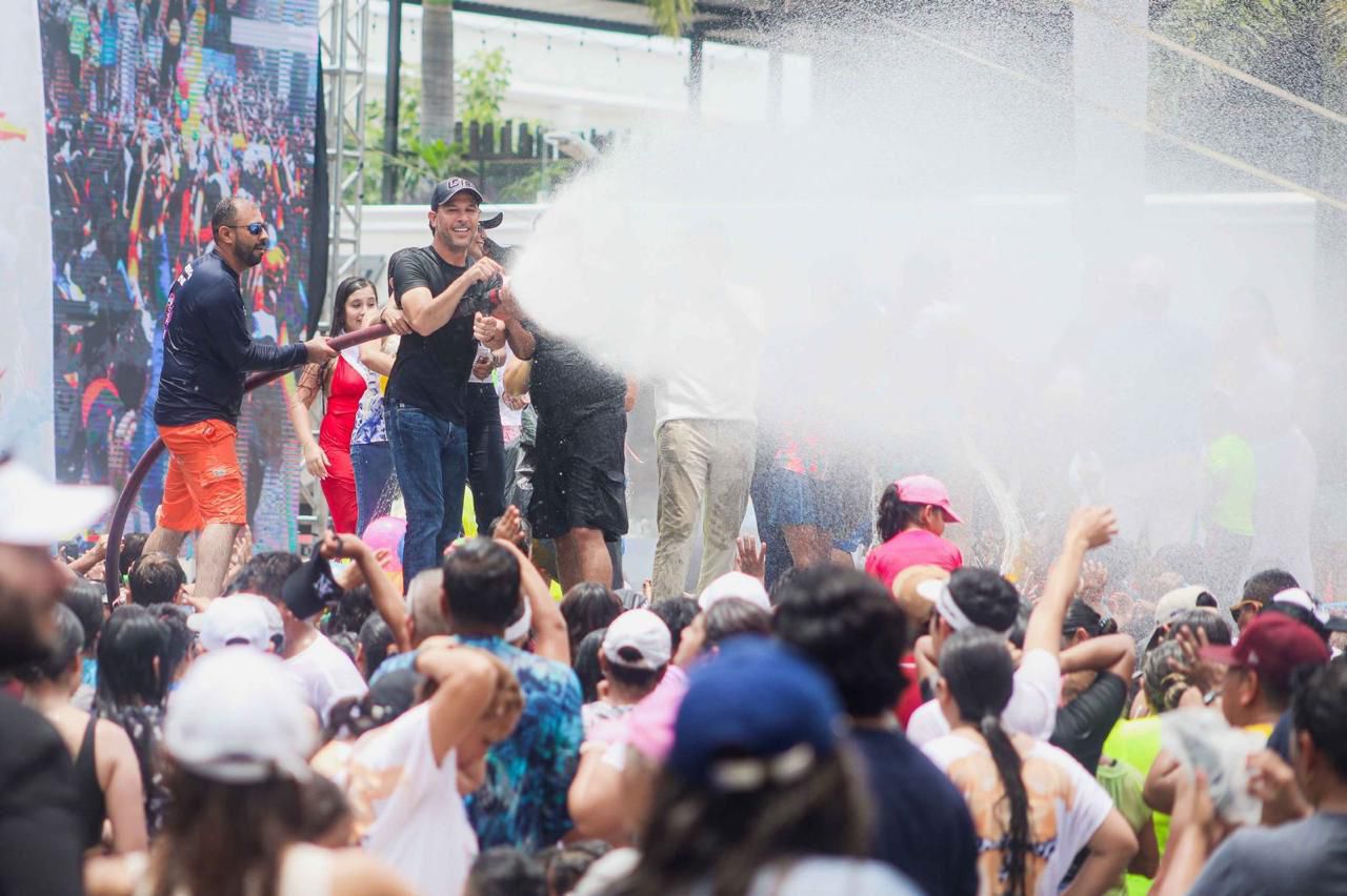 Para dar inicio, el Presidente Municipal, su esposa y su pequeña hija, activaron la primera manguera mojando a chicos y grandes.