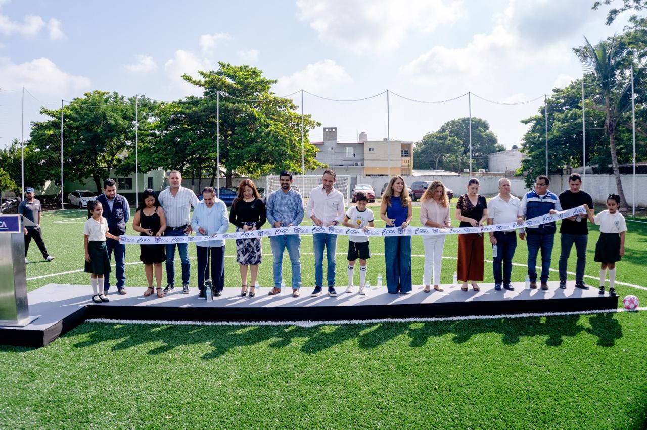 La nueva cancha cuenta con más de mil 800 metros cuadrados de pasto sintético tipo Tufting, resistente a temperaturas extremas, beneficiando directamente a más de 6 mil personas entre alumnos, docentes y padres de familia.