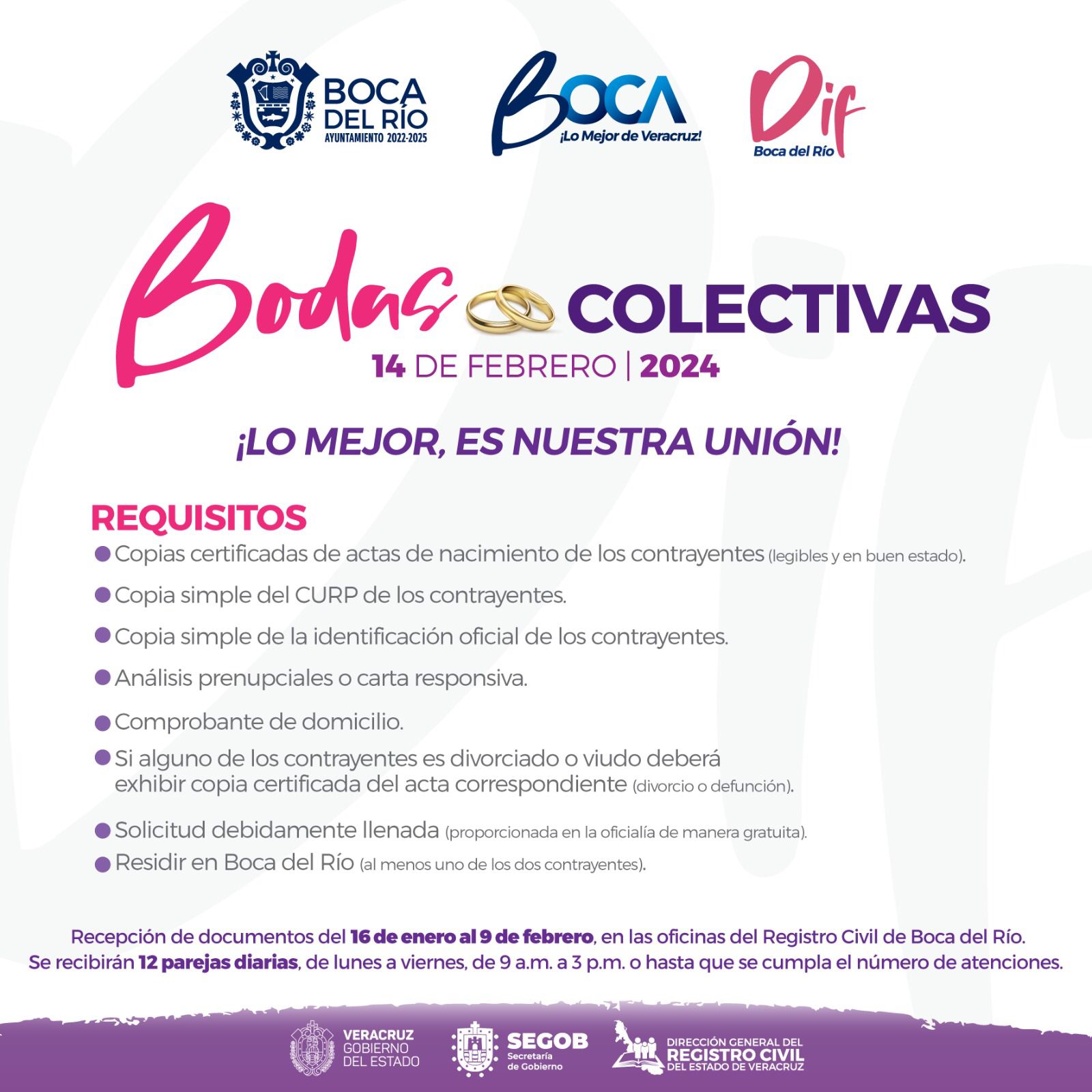 Las parejas interesadas podrán acudir a las oficinas del Registro Civil de Boca del Río a partir de este momento y hasta el 9 de febrero de lunes a viernes en horario de 9 a 15 horas; cabe destacar que se estarán otorgando 12 fichas diarias para realizar el trámite.