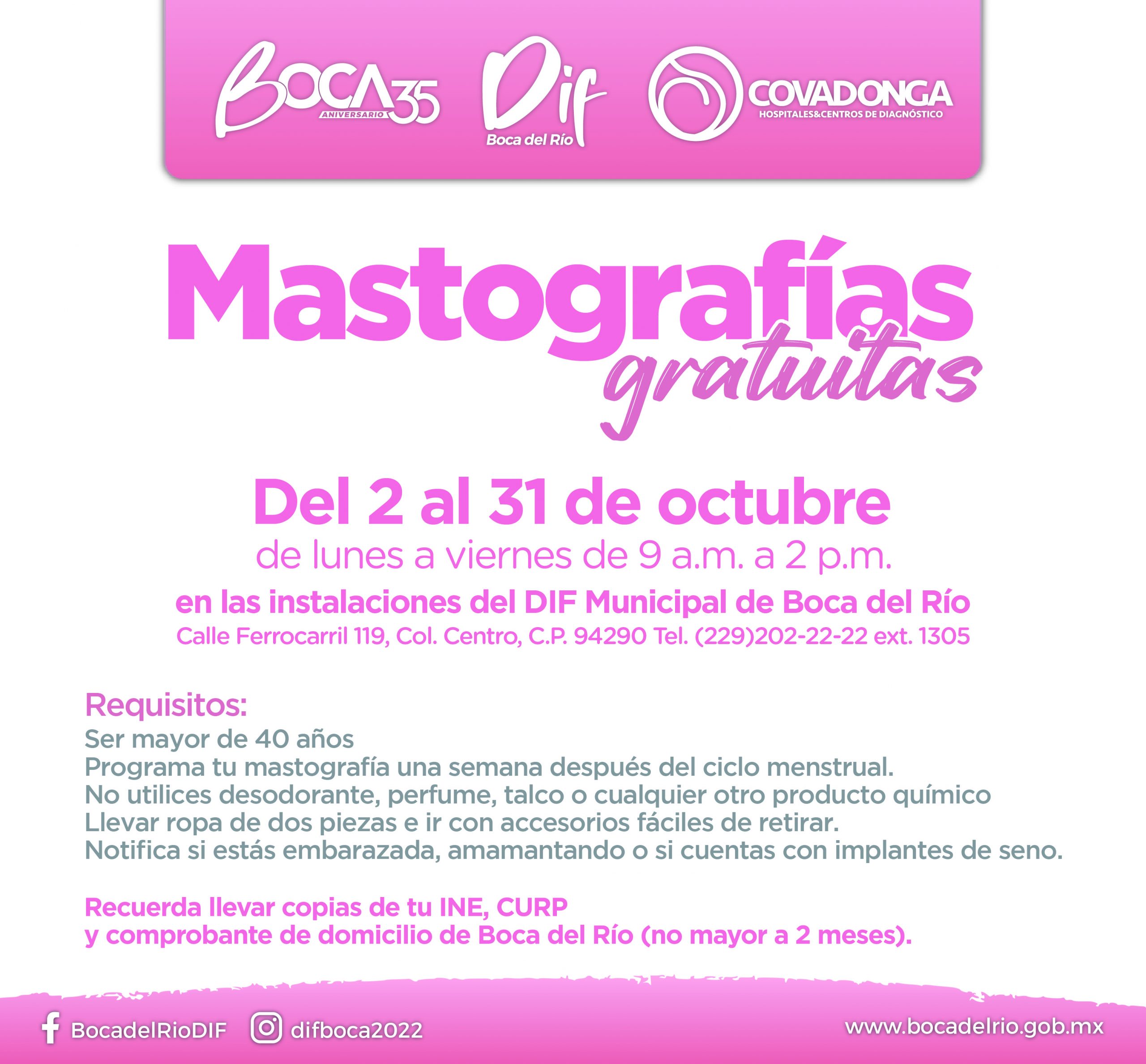 Las mastografías gratuitas se realizarán de lunes a viernes de 9 a.m. a 2 p.m. Las boqueñas mayores de 40 años deberán acudir a las instalaciones del DIF municipal ubicadas en calle Ferrocarril #119 entre Av. Veracruz y bulevar Vicente Fox.