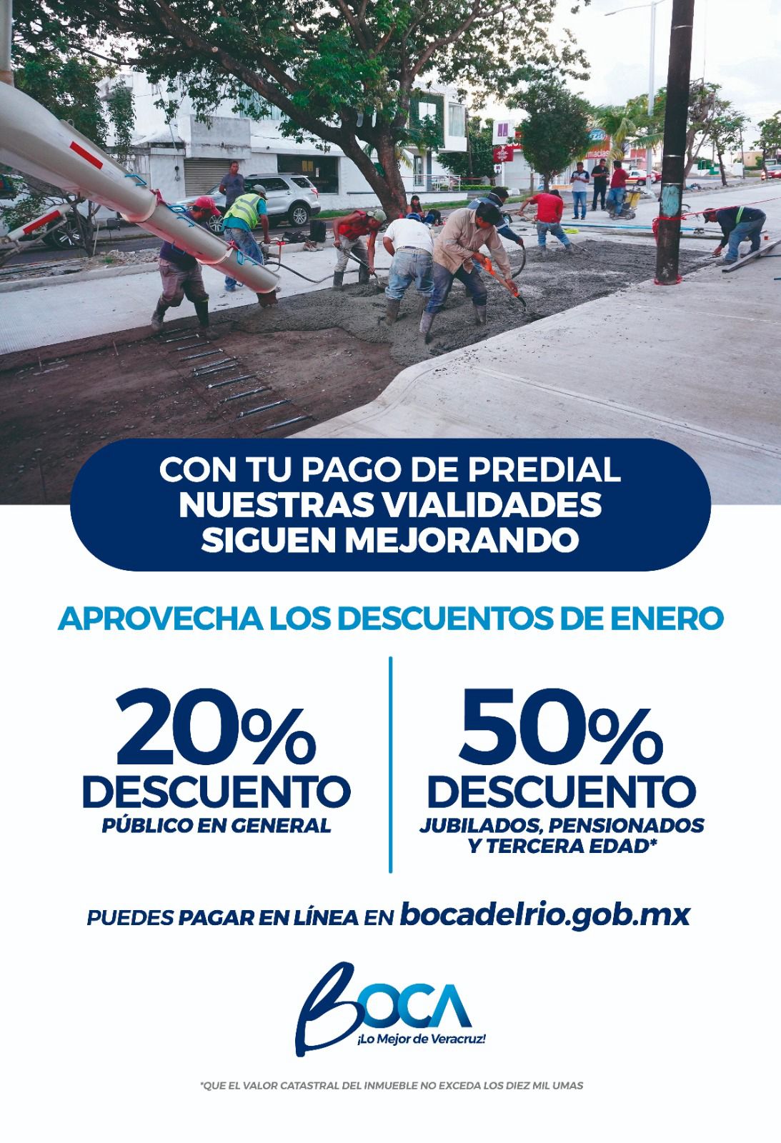 Como resultado del impuesto predial se han podido realizar obras como la pavimentación con concreto hidráulico de la Av. Juan Pablo Segundo, de la calle Independencia y Heriberto Jara Corona, así como la rehabilitación de Unidades Deportivas y los trabajos diarios de limpieza en la ciudad entre muchas obras más.