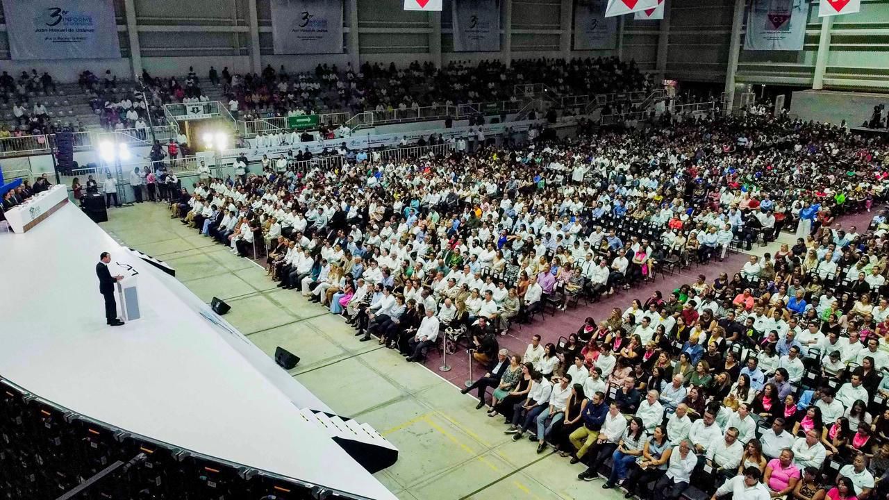 Ante más de cinco mil personas presentes en la Arena Veracruz, el Presidente Municipal fue acompañado por su esposa Melina Rivera de Unánue y su hija Aitana, además de sus señores padres y familia.